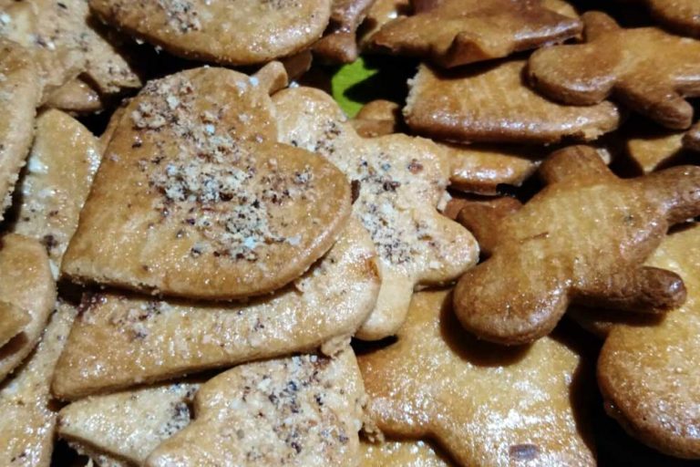 1 oeuf, 100g de sucre, 80g de pralinoise (chocolat en tablette au praliné), 250g de farine, 80g de beurre (1/2 sel), quelques amandes…