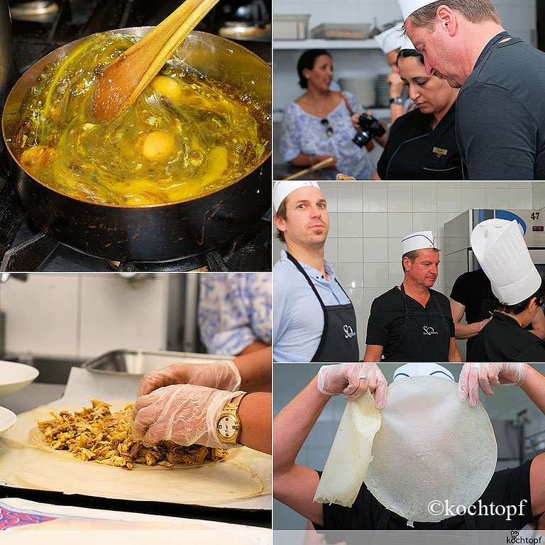 Préparer un plat à pastilla (une très large poêle à paella pourrait faire l’affaire) en le beurrant et en y disposant les feuilles de façon à ce qu’elles se chevauchent entre elles, tout en les imprégnant du reste d’huile de tournesol avec un pinceau et en laissant leur moitié en dehors pour qu’à la fin elles puissent recouvrir la farce.
